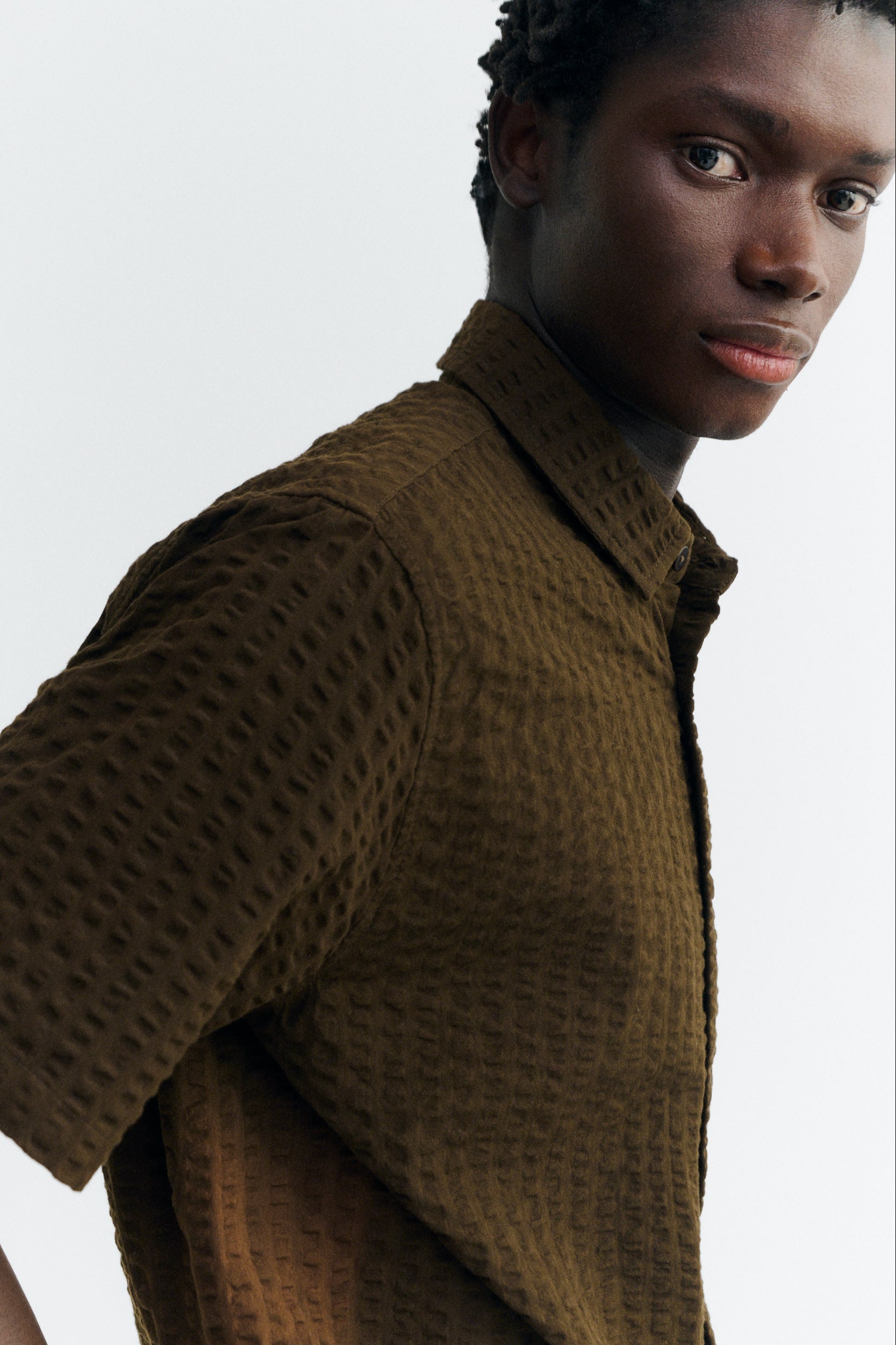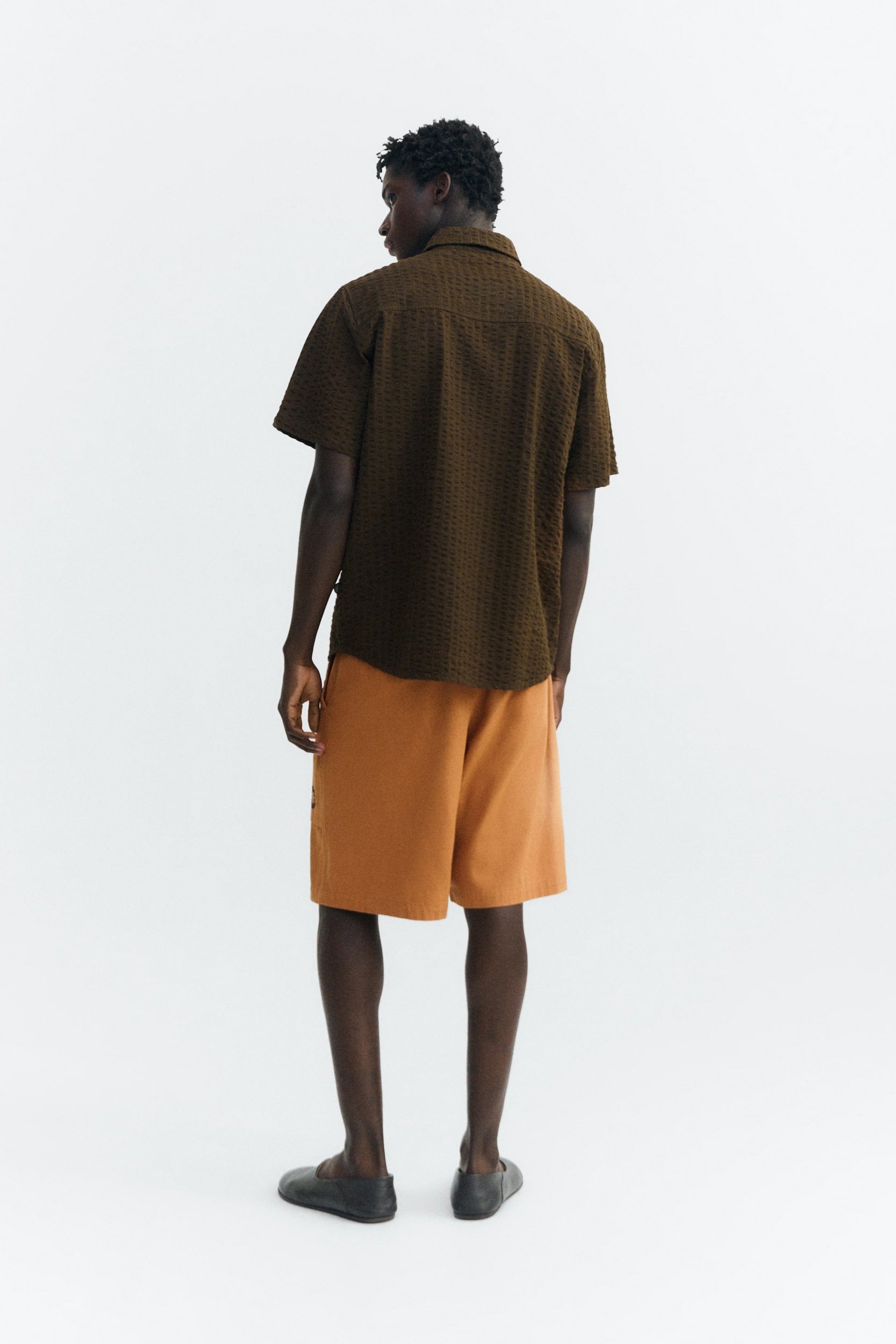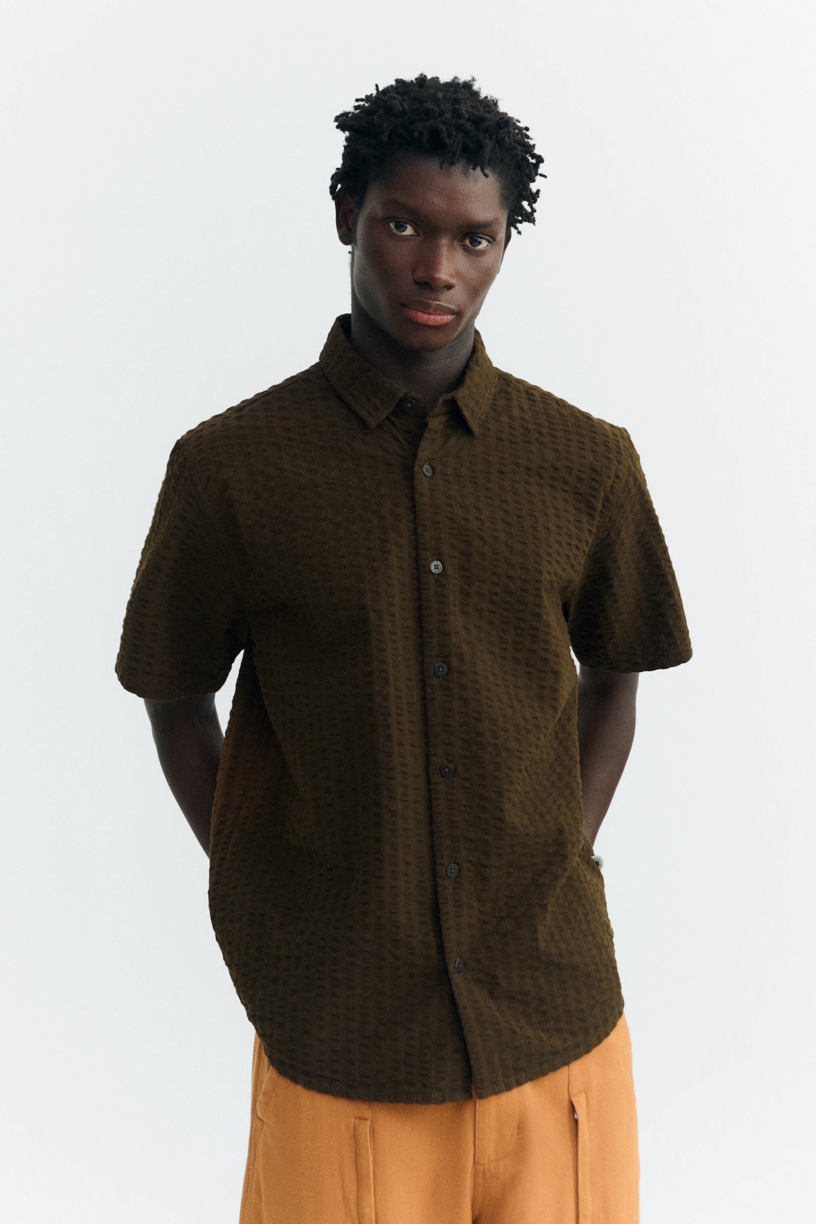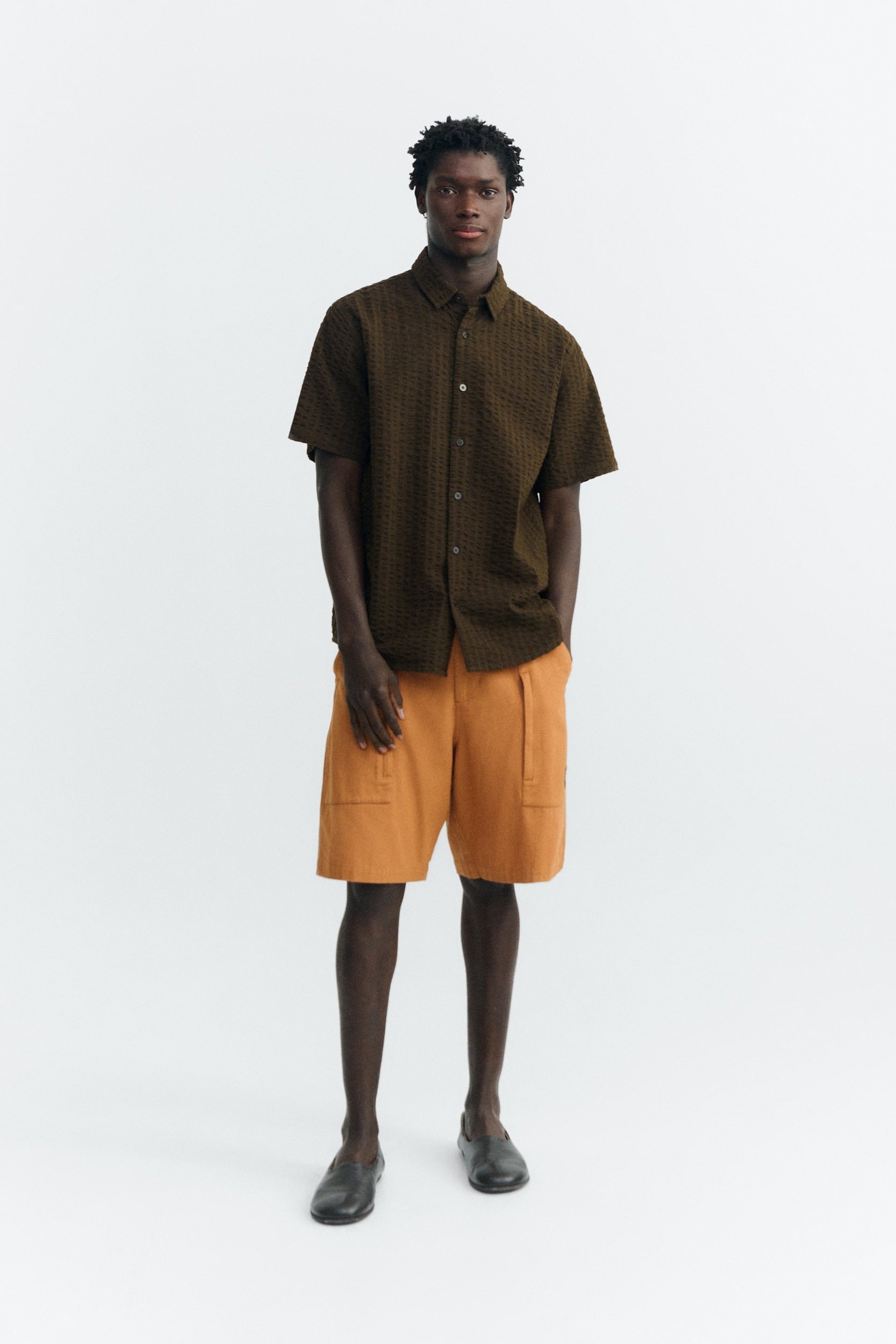 THINKING MU Tom Seersucker Shirt • Wood Brown
