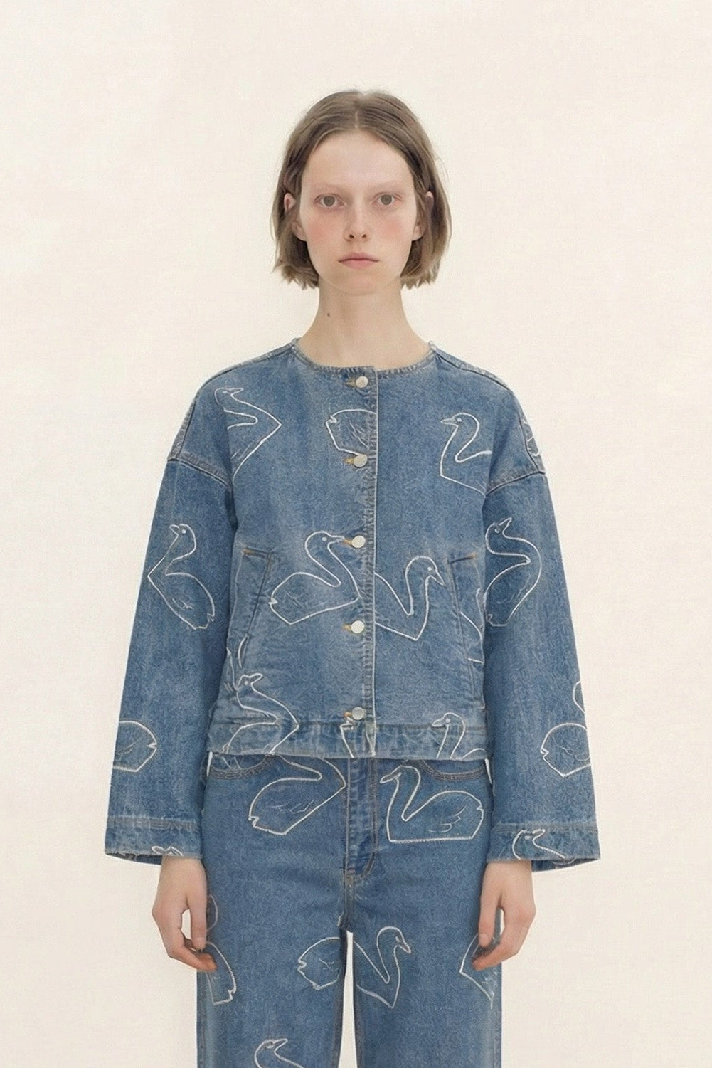 THE TINY BIG SISTER Swans Cropped Jacket • Light Wash Denim